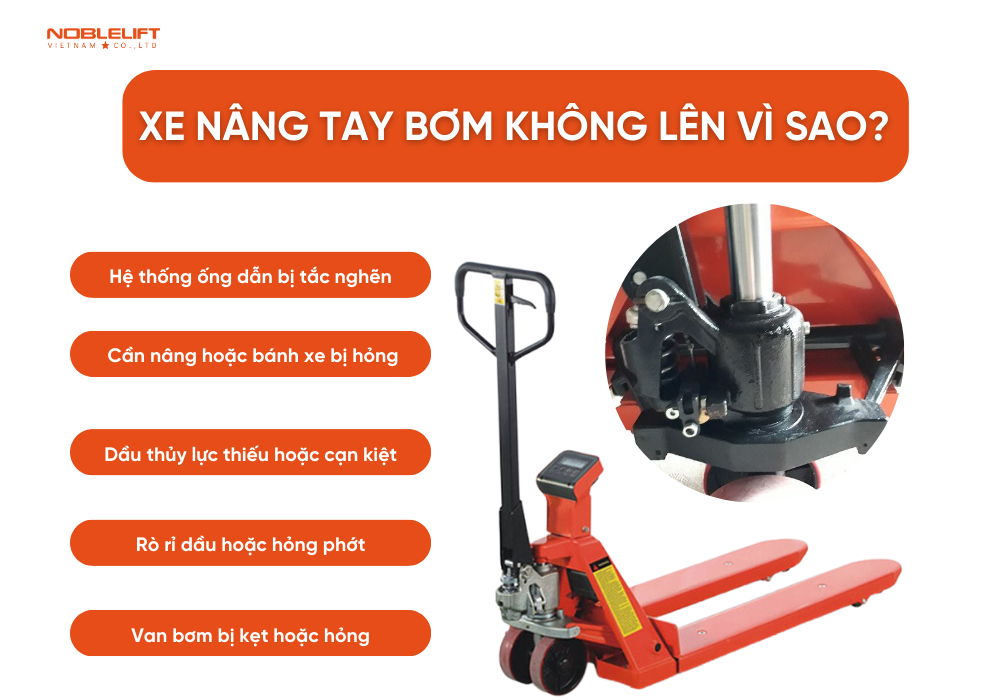Tình trạng xe nâng tay bơm không lên chủ yếu gồm những nguyên nhân chính sau: