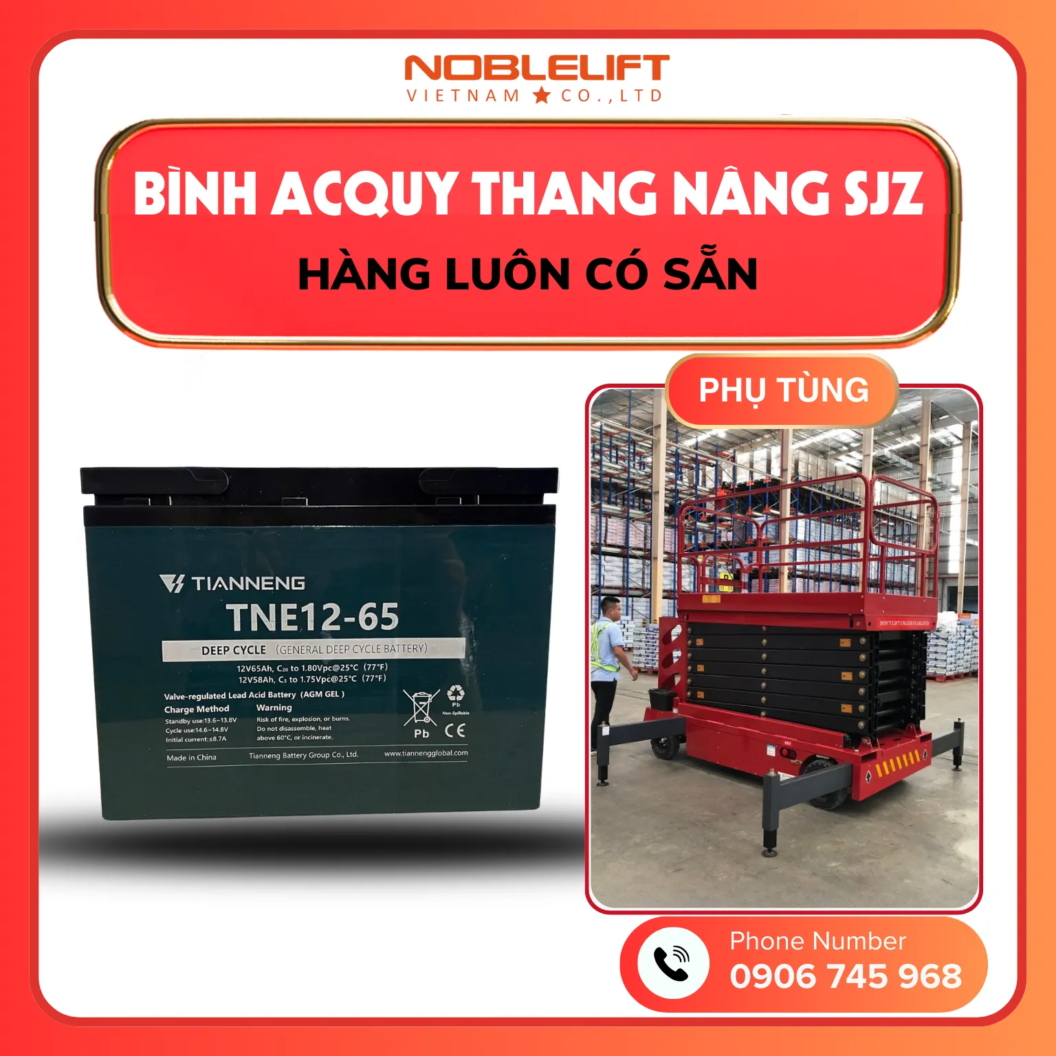 Bình điện Tianneng 12V-65Ah là nguồn cung cấp năng lượng chính cho thang nâng SJZ, thường được ghép nối thành hệ 24V hoặc 48V tùy cấu hình máy. Dòng bình khô kín khí có ưu điểm không cần bảo dưỡng thường xuyên, hạn chế rò rỉ và an toàn khi sử dụng trong môi trường kín như nhà xưởng hoặc trung tâm thương mại.
