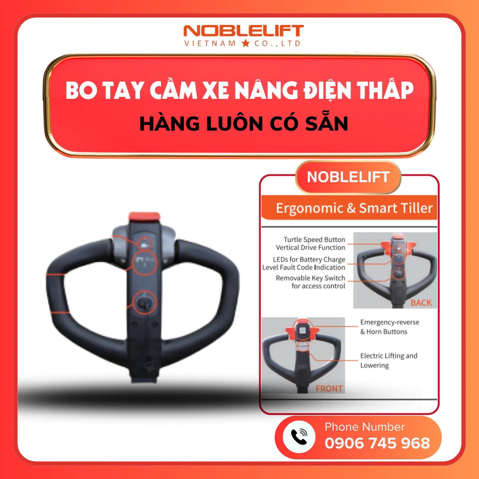 Bo tay cầm xe nâng điện thấp 1500 – 2000KG PTE15/20Q-A Noblelift được thiết kế với đầy đủ các nút điều khiển tiêu chuẩn, mang đến sự tiện lợi và an toàn cho người sử dụng. Ở mặt sau, tay cầm có nút điều khiển tốc độ chậm (Turtle Speed Button) cùng chức năng lái thẳng đứng (Vertical Drive Function), đi kèm đèn LED hiển thị mức sạc pin và báo lỗi, giúp người vận hành dễ dàng theo dõi tình trạng xe. Ngoài ra, khóa công tắc có thể tháo rời được tích hợp để kiểm soát quyền truy cập. Ở mặt trước, tay cầm được trang bị nút đảo chiều khẩn cấp và còi báo (Emergency-reverse & Horn Buttons), cùng hệ thống điều khiển nâng – hạ điện (Electric Lifting and Lowering) bố trí thuận tiện, đảm bảo quá trình vận hành diễn ra nhanh chóng và an toàn.