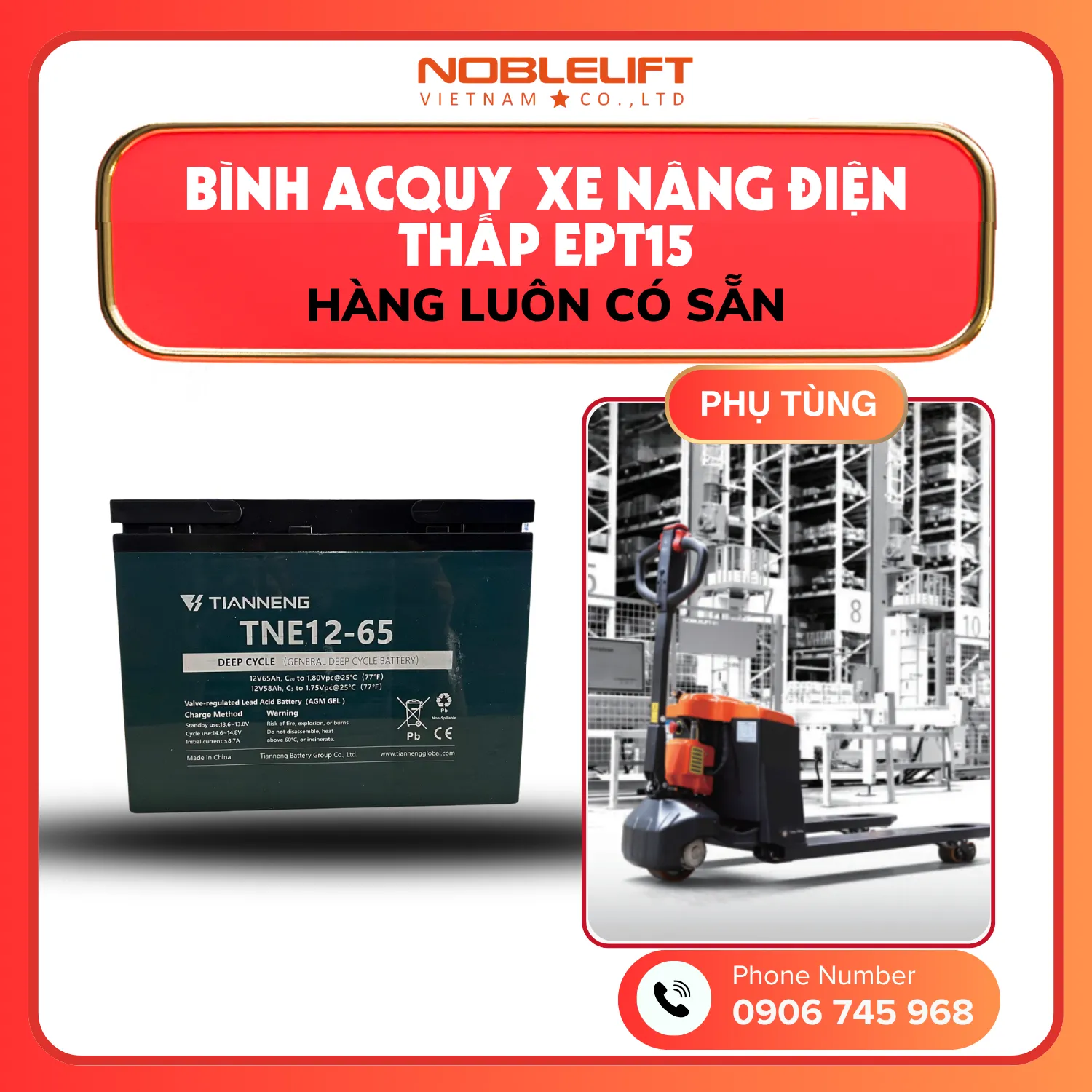 Bình điện Tianneng 12V-65Ah là nguồn cung cấp năng lượng chính cho xe nâng điện thấp EPT15Q, thường được ghép thành hệ điện áp 24V để vận hành toàn bộ hệ thống. Với thiết kế kín khí, dòng bình khô này không cần bảo dưỡng định kỳ như châm nước, đồng thời hạn chế tối đa rò rỉ axit, đảm bảo an toàn khi sử dụng trong môi trường kín như kho hàng hoặc siêu thị.