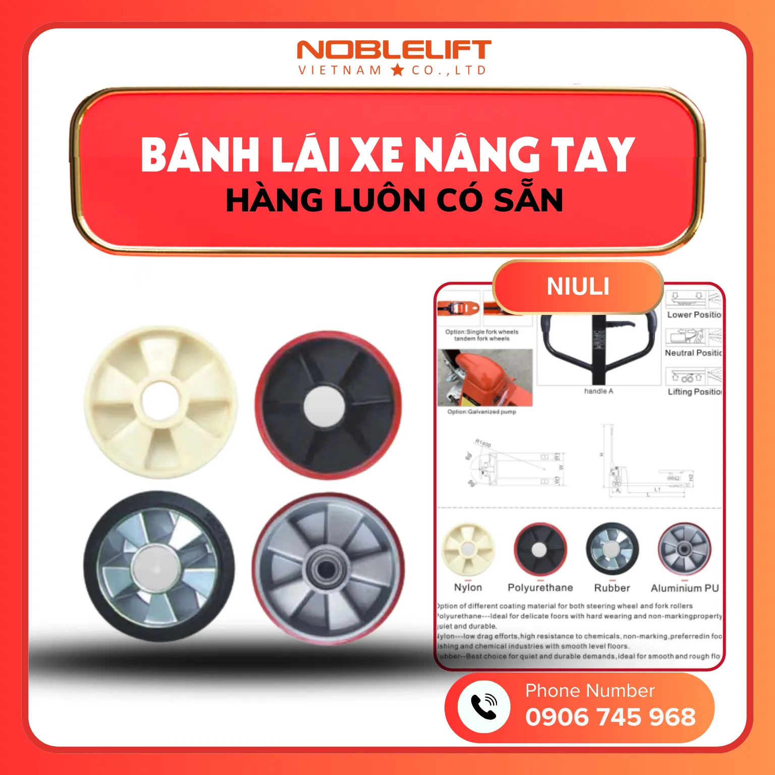 Bánh xe nâng tại Noblelift được sản xuất với nhiều chất liệu khác nhau nhằm đáp ứng đa dạng nhu cầu sử dụng trong từng môi trường làm việc. Bánh Nylon có ưu điểm chịu lực tốt, ít ma sát, chống hóa chất hiệu quả, phù hợp cho các ngành thực phẩm, thủy sản hay hóa chất trên nền phẳng. Bánh Polyurethane (PU) lại được ưa chuộng nhờ độ bền cao, không để lại vết trên sàn, vận hành êm ái và thích hợp cho các sàn nhà xưởng yêu cầu sự tinh tế. Bánh cao su (Rubber) mang đến sự êm ái và độ bền vượt trội, phù hợp cho cả nền phẳng và gồ ghề, đảm bảo sự thoải mái khi vận hành liên tục. Ngoài ra, bánh hợp kim nhôm bọc PU (Aluminium PU) kết hợp sự chắc chắn của nhôm và độ êm mượt của PU, giúp tăng tuổi thọ và hiệu quả sử dụng trên nhiều bề mặt khác nhau. Với 4 lựa chọn này, Noblelift mang đến cho khách hàng giải pháp tối ưu, vừa bền bỉ vừa an toàn trong mọi điều kiện làm việc.