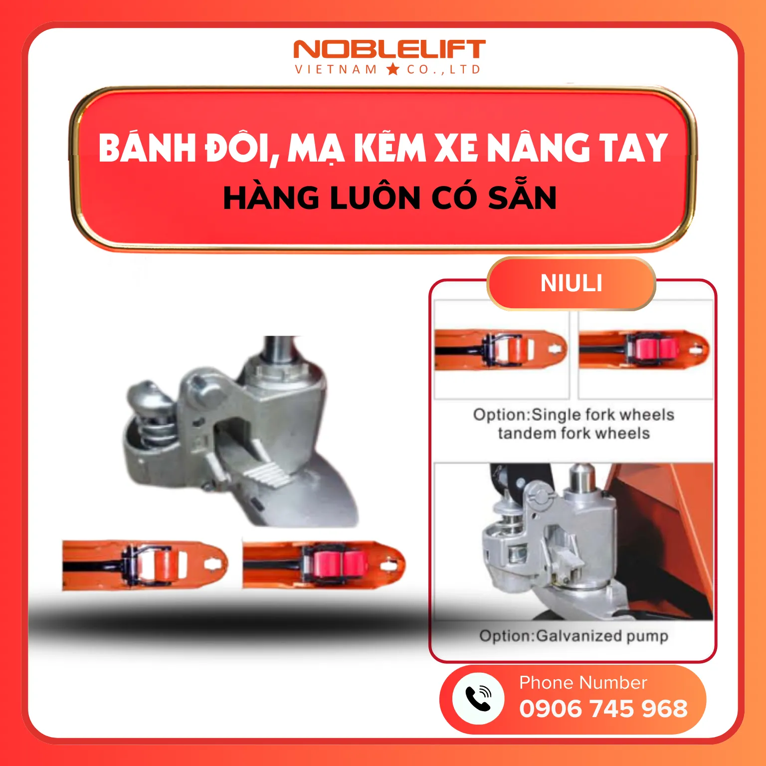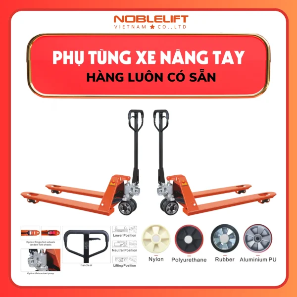 Sản phẩm xe nâng tay Noblelift được thiết kế linh hoạt với nhiều tùy chọn nhằm đáp ứng nhu cầu sử dụng đa dạng. Người dùng có thể lựa chọn bánh đơn hoặc bánh đôi ở càng nâng, giúp xe hoạt động hiệu quả trên nhiều loại địa hình và phù hợp với khối lượng hàng khác nhau. Bên cạnh đó, bơm thủy lực mạ kẽm (Galvanized pump) mang đến độ bền vượt trội, chống ăn mòn, chống gỉ sét và đảm bảo khả năng vận hành ổn định trong thời gian dài. Nhờ những cải tiến này, xe nâng tay Noblelift không chỉ tối ưu hiệu quả nâng hạ mà còn gia tăng độ bền, phù hợp cho cả môi trường kho xưởng khắt khe.