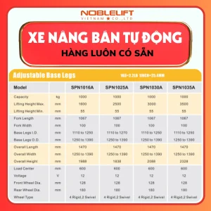 Xe nâng bán tự động 1000kg 1.6 – 3.5M SPN10SL Noblelift gồm 4 model chính: SPN1016A, SPN1025A, SPN1030A và SPN1035A, tất cả đều có tải trọng 1000kg. Chiều cao nâng tối đa lần lượt là 1600mm, 2500mm, 3000mm và 3500mm, trong khi chiều cao nâng thấp nhất chỉ 55mm. Kích thước càng nâng dài 1067mm, rộng 100mm, đảm bảo phù hợp với nhiều loại pallet.