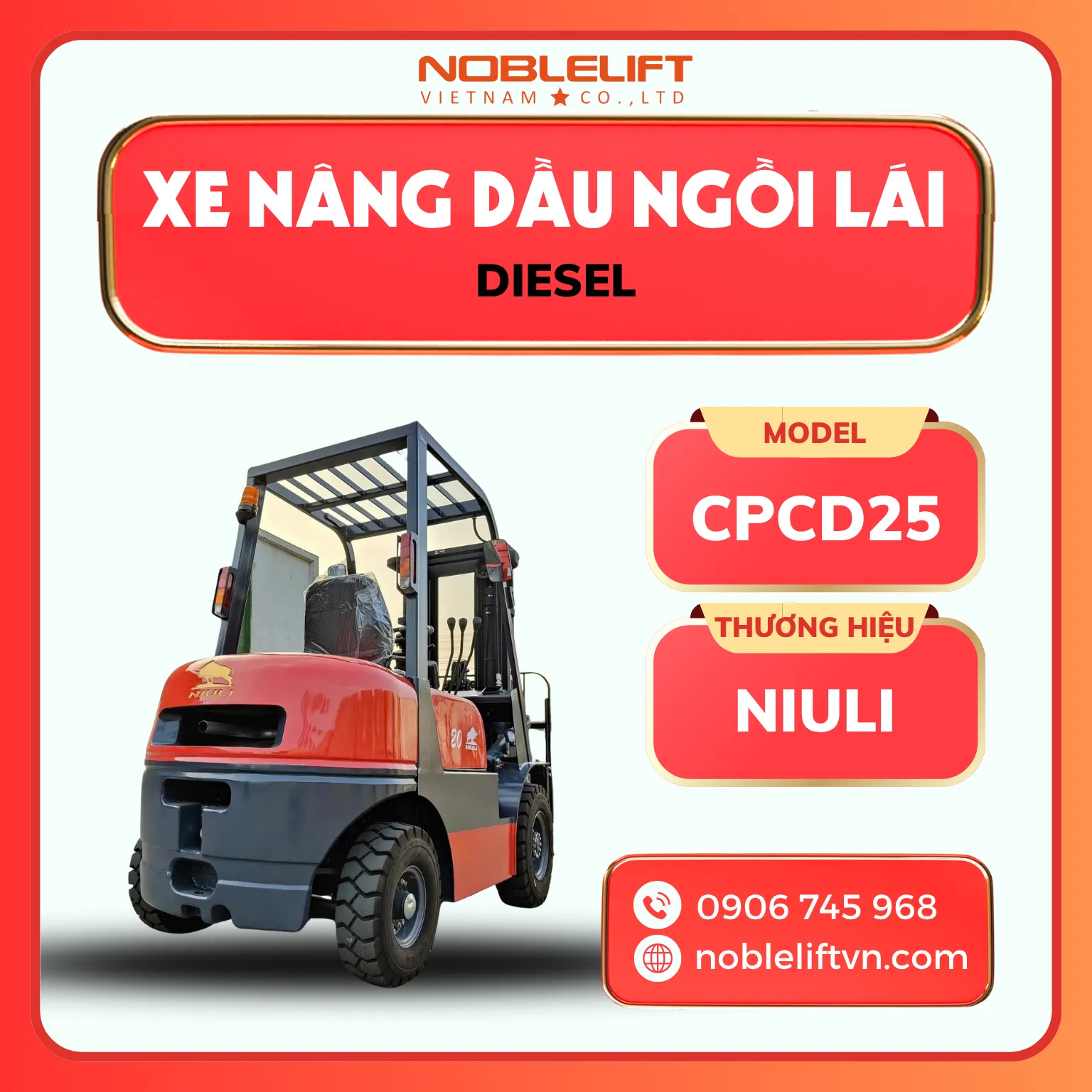 Mọi thắc mắc hãy liên hệ với chúng tôi để được hỗ trợ thêm. Rất mong rằng qua bài viết trên đây của chúng tôi, khách hàng có thể tìm được một sản phẩm ưng ý và phù hợp nhất với mình. Còn chần chờ gì mà không gọi ngay cho đội ngũ của Noblelift để sở hữu xe nâng dầu ngồi lái 2500kg CPCD25 NIULI mới nhất, chất lượng nhất bạn nhé.