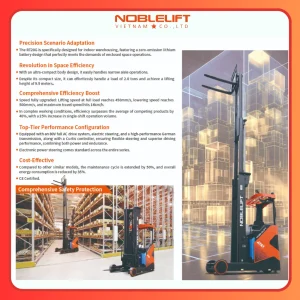 Xe nâng Reach Truck 2000kg RT20G Noblelift được thiết kế chuyên dụng cho các kho hàng có lối đi hẹp nhưng yêu cầu chiều cao lưu trữ lớn. Với khả năng nâng tải 2000kg và chiều cao nâng tối đa lên đến 9,5 mét, chiếc xe này giúp doanh nghiệp tận dụng tối đa không gian theo chiều cao, từ đó tiết kiệm diện tích kho bãi. RT20G được trang bị pin Lithium Iron Phosphate (LFP) an toàn, sạc nhanh và có tuổi thọ cao, giúp xe hoạt động bền bỉ trong nhiều ca làm việc liên tục. Kết hợp cùng động cơ mạnh mẽ, tốc độ di chuyển nhanh và khả năng nâng hạ ổn định, RT20G mang lại hiệu suất vượt trội cho các trung tâm logistics, nhà máy và kho lạnh hiện đại.