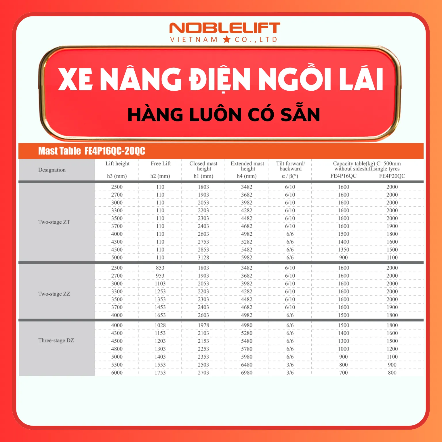 Bảng thông số kỹ thuật xe nâng điện ngồi lái 2000kg FE4P20QC Noblelift