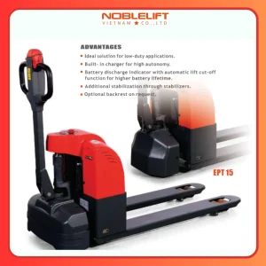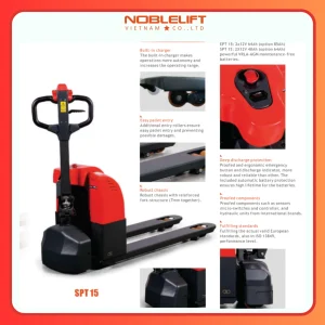 Xe nâng điện thấp 1500kg EPT15 và SPT15 Noblelift là dòng xe nâng điện mini, được thiết kế dành cho nhu cầu vận chuyển pallet tải trọng nhẹ đến trung bình với sức nâng khoảng 1.500 kg. Đây là lựa chọn hoàn hảo cho các doanh nghiệp vừa và nhỏ, siêu thị, cửa hàng hay kho xưởng có không gian hạn chế nhưng cần một giải pháp vận chuyển nhanh chóng, an toàn và gọn nhẹ.