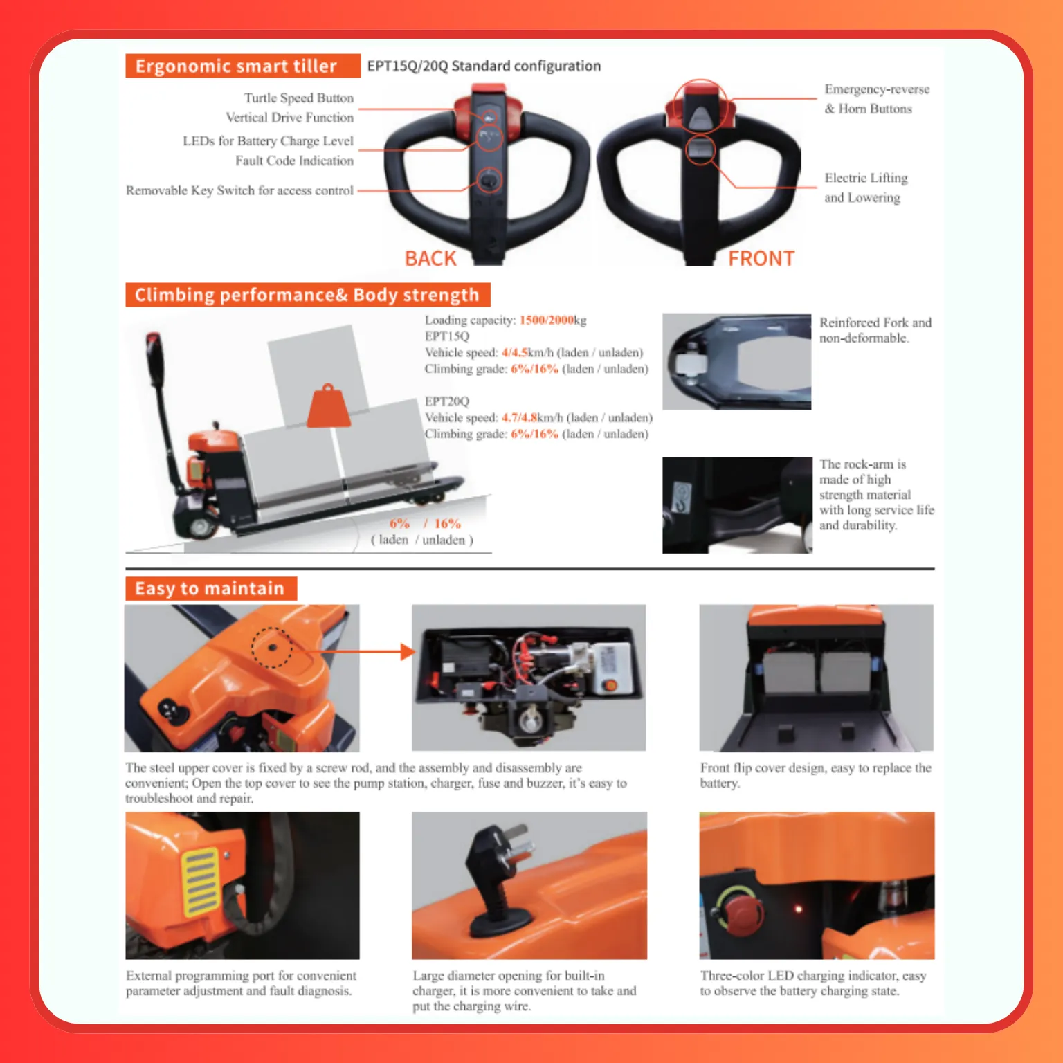 Xe nâng điện thấp 1.5-2 Tấn EPT15/20Q Noblelift là dòng xe nâng tay điện tự hành tầm thấp được thiết kế nhằm đáp ứng nhu cầu vận chuyển hàng hóa nhanh chóng, an toàn và hiệu quả. Xe sở hữu tải trọng nâng 1.5 đến 2 tấn, thích hợp cho việc di chuyển pallet trong kho hàng, siêu thị, xưởng sản xuất và cả các khu vực hẹp. Với hệ thống pin lithium hiện đại, EPT15/20Q mang lại hiệu suất ổn định, thời gian hoạt động dài và tiết kiệm chi phí bảo trì so với các dòng pin axit chì truyền thống.
